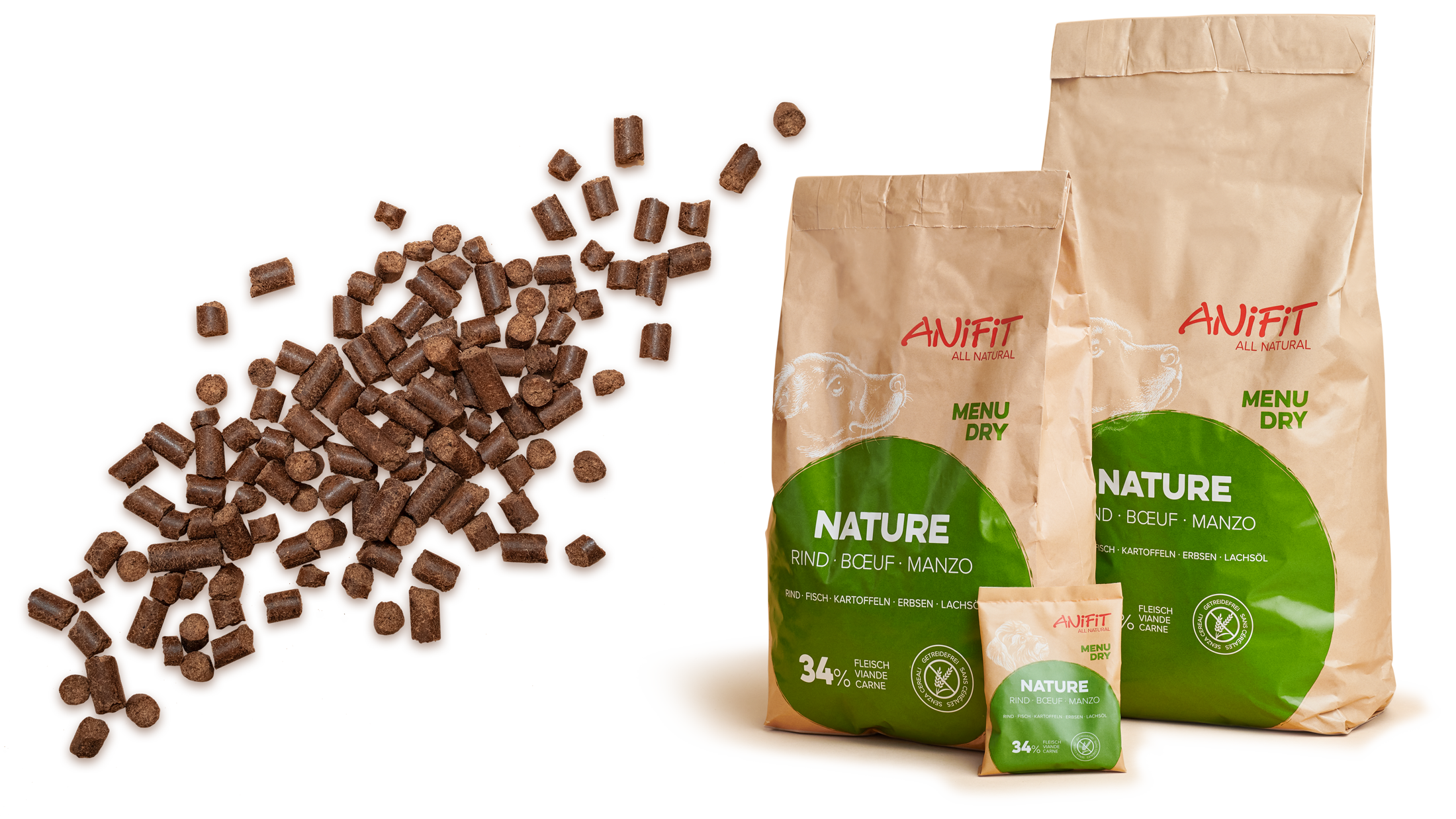 Nos aliments secs pressés à froid pour les chiens sont idéaux en tant qu'aliments complets pour le chien, car lors du processus de pressage à froid, les ingrédients sont mélangés et produits de manière particulièrement soignée.